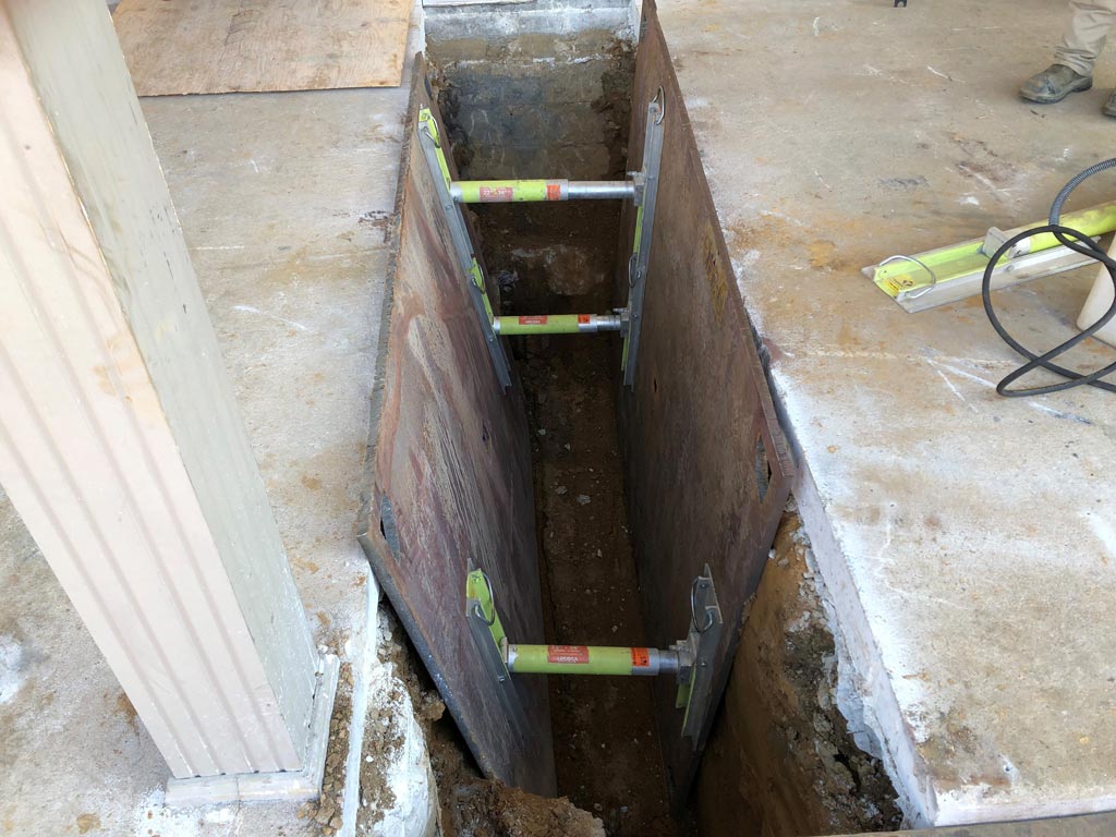 Hydraulic shores with Finform were used for a sewer line tie-in with gas utilities overhead. 10'L x 11'W x 10'D.Pennsauken, NJ