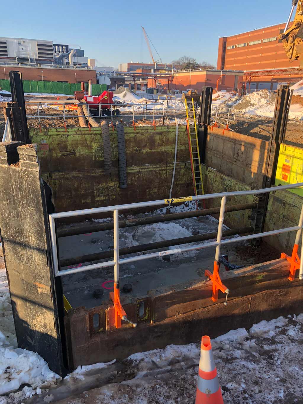 Multiple TrenchTech products were used to support this project - a 20' x 40' x 18' Slide Rail System along with the new Trenchbox ladder and Aluminum Guard Fence were included for a bore pit that the customer had to install to allow boring out of both sides. TrenchTech engineered both the shoring and the thrust blocks for this project. This sewer line bore under United States Postal Service property in Fairfax VA had 36" casings to upgrade the decades-old sewer line. TrenchTech worked with the contractor, County Reps, and a 3rd-party engineering firm throughout the submittal process to provide a site specific plan to minimize the footprint and stay in the LOD allotted during the design phase. The project had a tight timeline due to this being a highly utilized facility for the holiday season.Back to Project Gallery