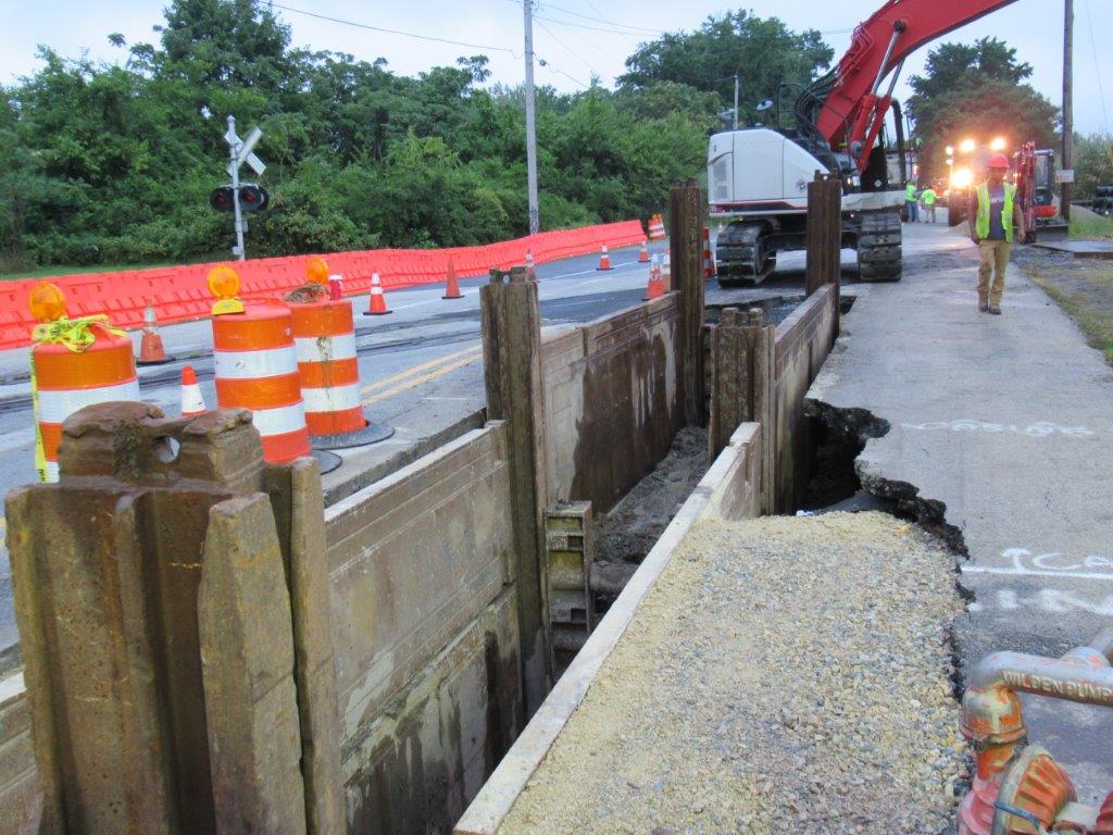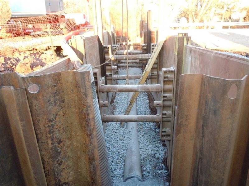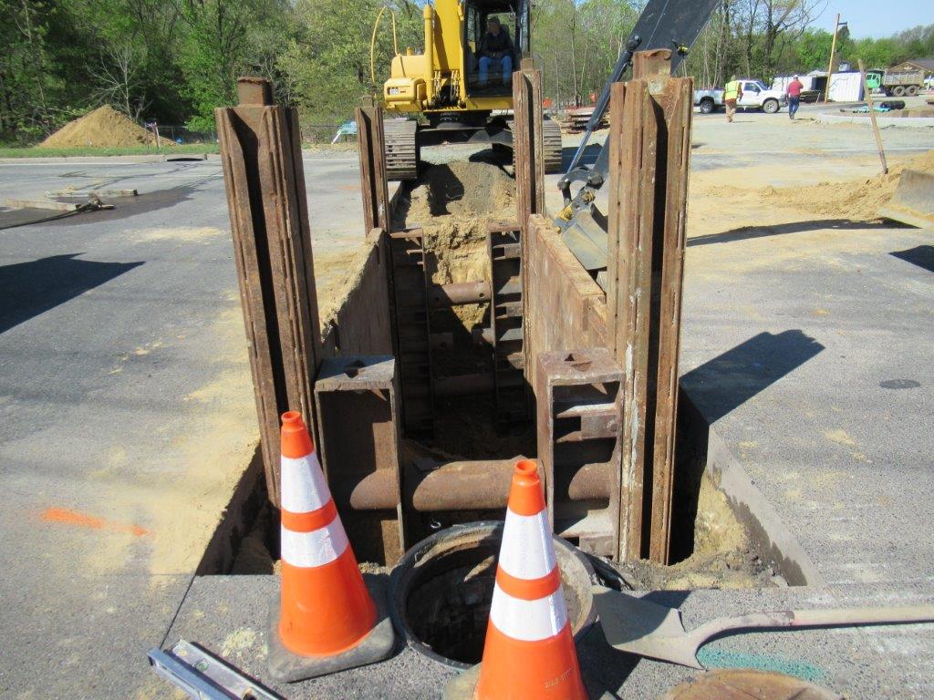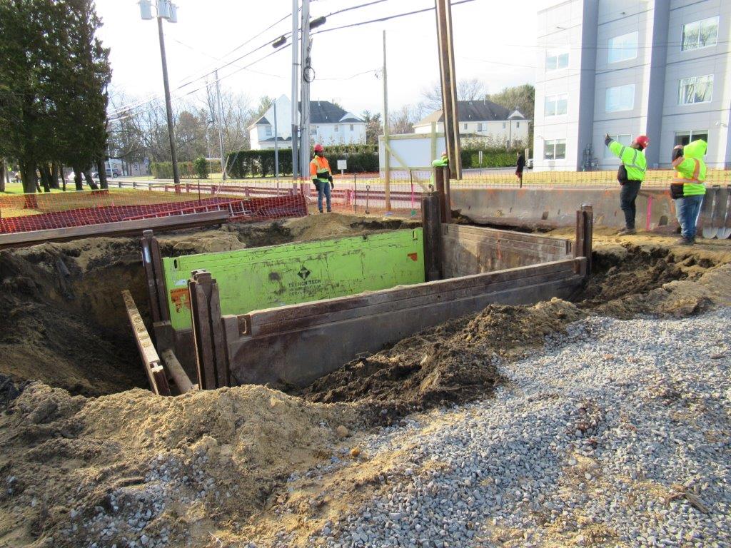 Start of a 41' long x 24' wide x 24' deep multi-bay slide rail system to replace a damaged sewer line that is causing a sink hole, and solidify the surrounding area that was compromised from the leak.West Point, PA