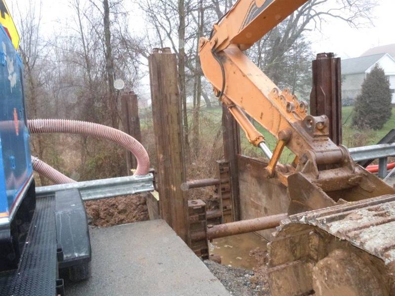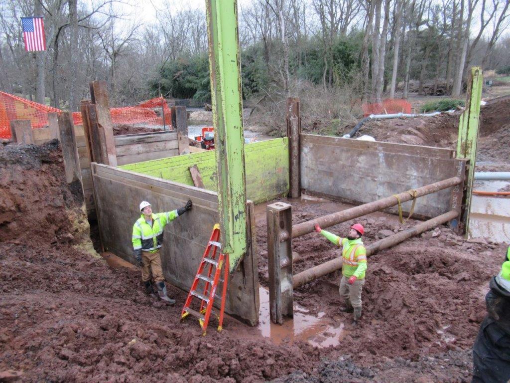 Sewer main upgrade along the Perkiomen Creek. This is a 20x37x20 2-Bay slide rail system with sheets to make dog houses around existing pipes.Adelphia, NJ