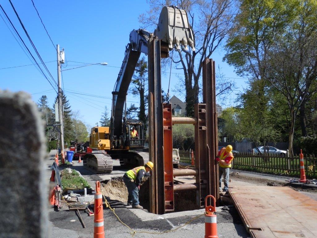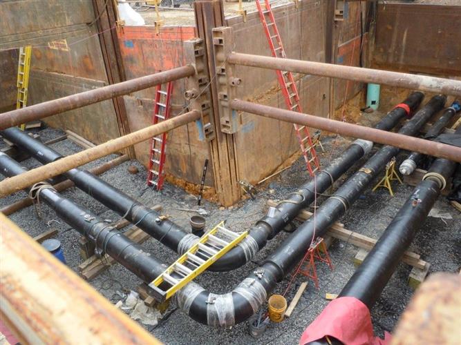 At the base of Hershey Park a jack and bore operation utilize two launch pits to complete the job facing various obstructions and soil conditions. A 36' long x 16' wide x 16' deep multi bay Slide Rail system was installed on one end, and 24' long trench boxes were installed on the other to accomplish the bore with an 84" casing.Nyack, NY
