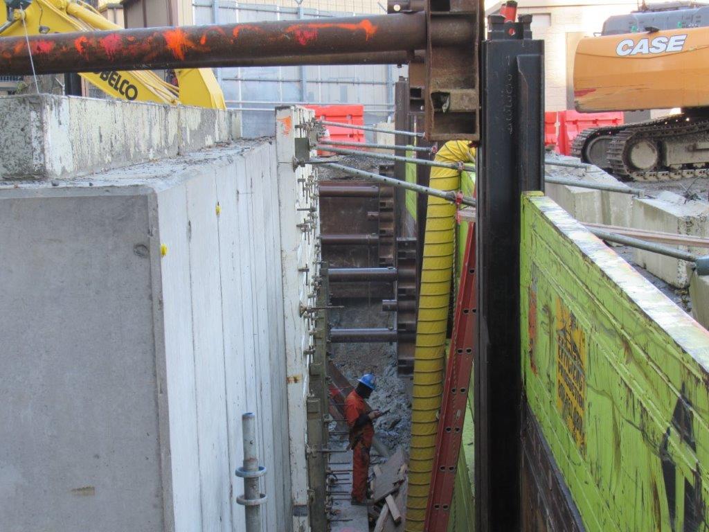 52' long x 8' wide x 16' deep 2-sided linear multi-bay Slide Rail system for an apartment building foundation. 4-way post installed to make a 90 degree turn with a 10' long bay to finish the run.Manhattan, NY