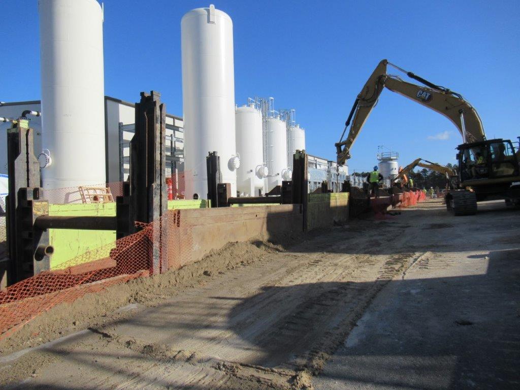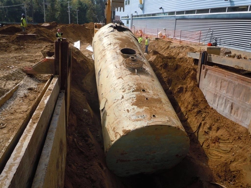 Setting a 8' diameter tank on top of the 2' thick footer. This is for the mixed chemicals holding tank at Gordon's Corner water treatment plant.Fuel oil tank removal and soil remediation at a drug company. One tank is removed and they are going to leap frog the shoring to remove two more tanks.