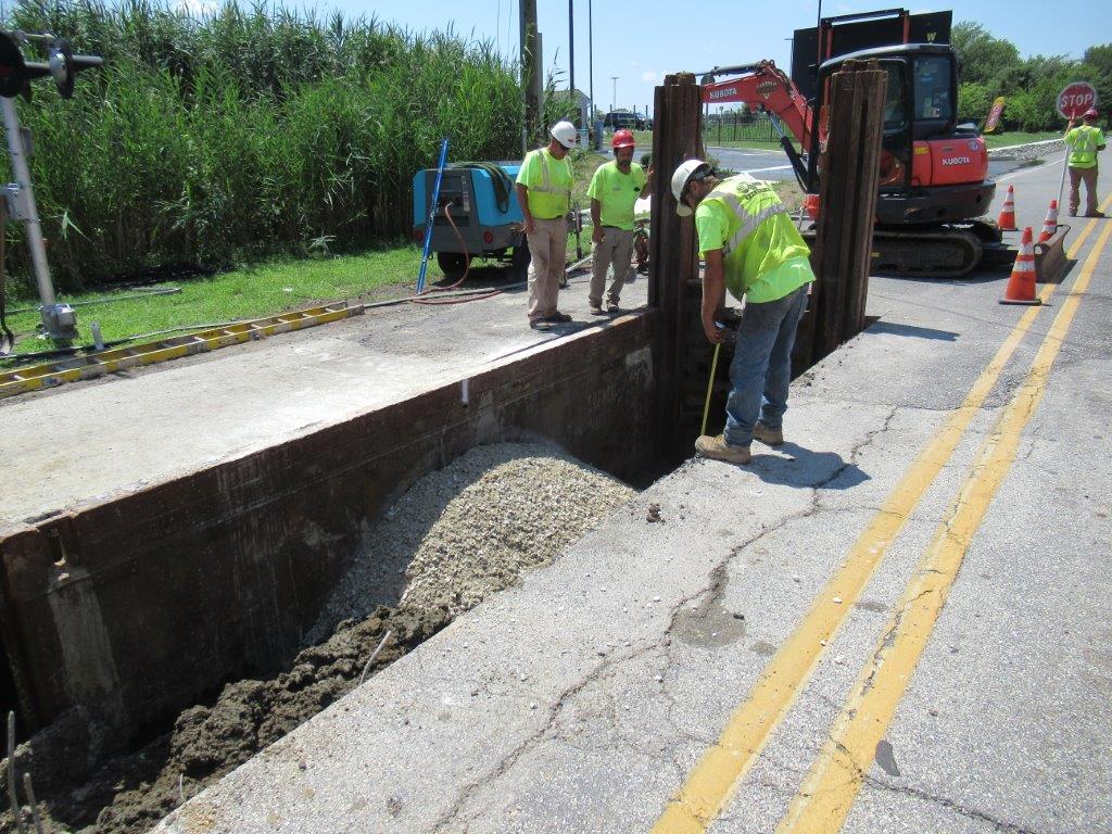 Joe Somers, TrenchTech's lead installer with over 12 years of experience, works alongside with clients to ensure smooth installations. This is a Slide Rail multiple-bay installation; the first of two bridge abutments 20 x 41 x 8-16 deep.Willingboro, NJ